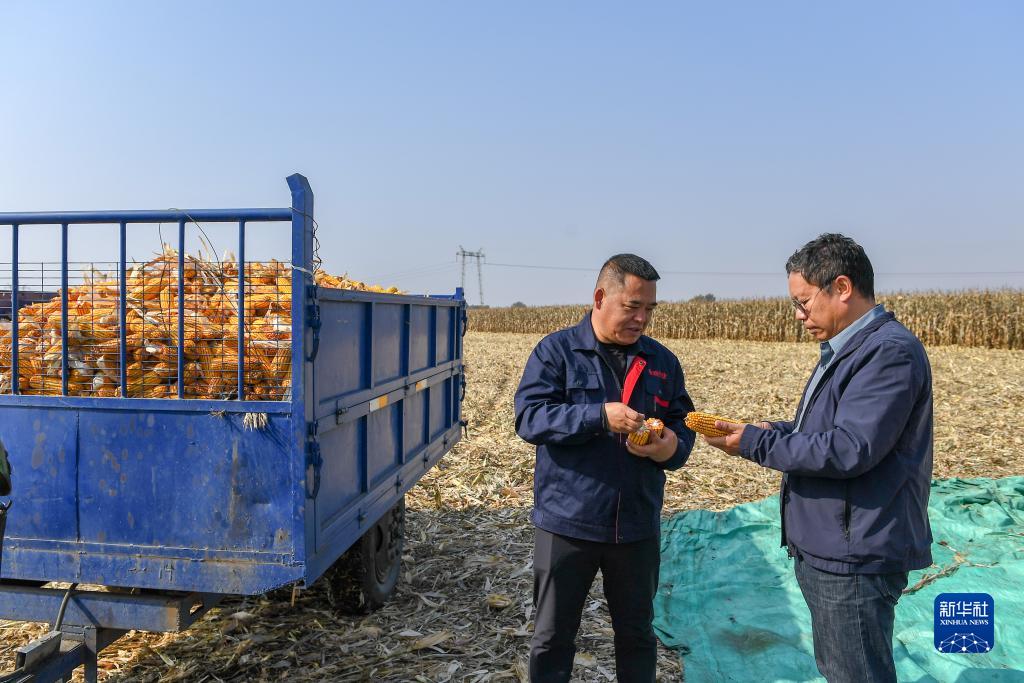 10月11日,在吉林省公主嶺市范家屯鎮(zhèn)孟家村,正高級農(nóng)藝師邱英楠(右)向乾程農(nóng)民專業(yè)合作社理事長王成了解秋收情況。