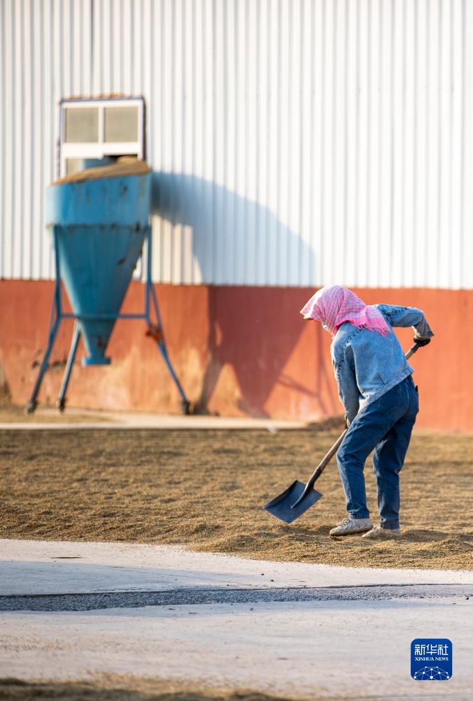 在寧夏銀川市賀蘭縣立崗鎮通義村,農民在曬場勞作(10月10日攝)。