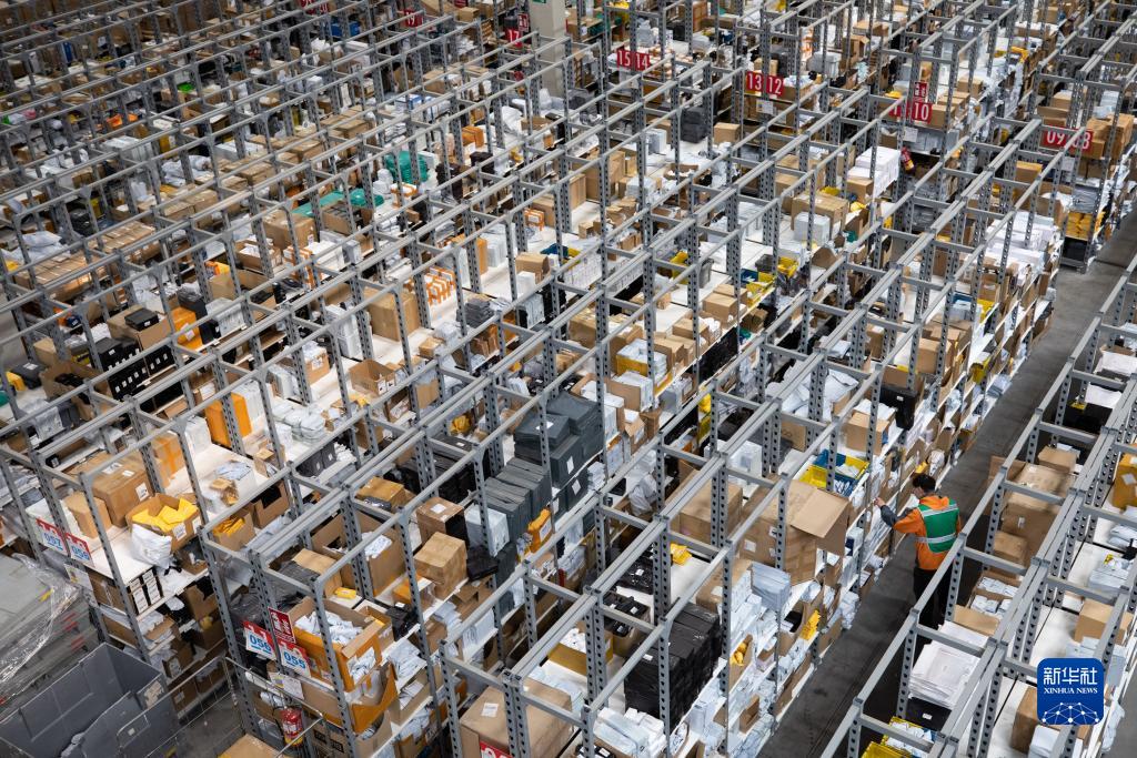 工作人員在西班牙瓜達拉哈拉市的菜鳥海外倉分揀商品(2020年11月11日攝)。