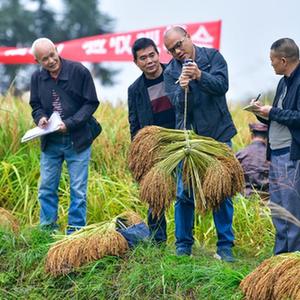 當(dāng)日,貴州省黔東南苗族侗族自治州從江縣舉辦2023年香禾糯現(xiàn)場測產(chǎn)驗收活動,當(dāng)?shù)囟弊宕迕衩χ墒铡徇\測產(chǎn)試驗田里的香禾糯稻谷。