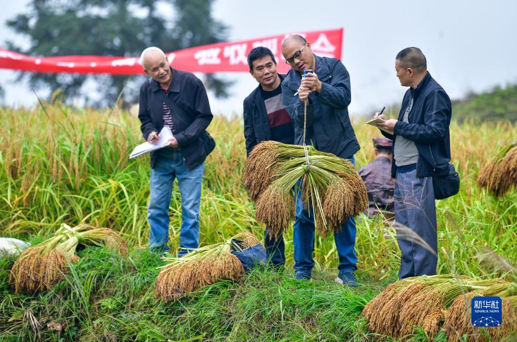 10月11日,農技人員在貴州省從江縣高增鄉建華村現場測產香禾糯稻谷。
