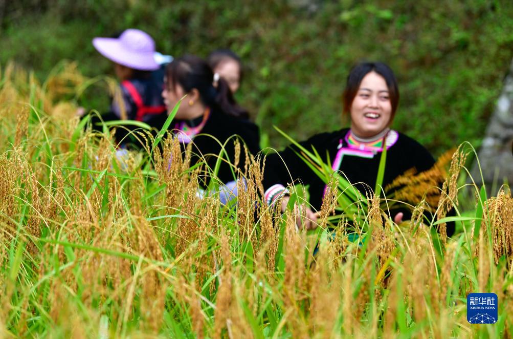 10月11日,村民在貴州省從江縣高增鄉(xiāng)建華村采收香禾糯稻谷。