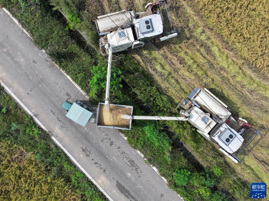 金秋時節,湖南省長沙市望城區烏山街道維梓村種植的中稻迎來收獲季,當地農戶搶抓農時收割水稻、烘干稻谷,確保顆粒歸倉。