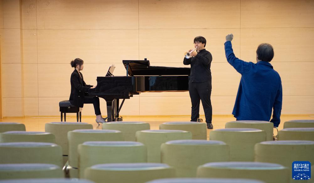 9月14日,中央音樂學(xué)院小號專業(yè)學(xué)生紀(jì)政旭(中)在陳光教授(右)指導(dǎo)下練習(xí)吹奏海頓的《降E大調(diào)小號協(xié)奏曲》。
