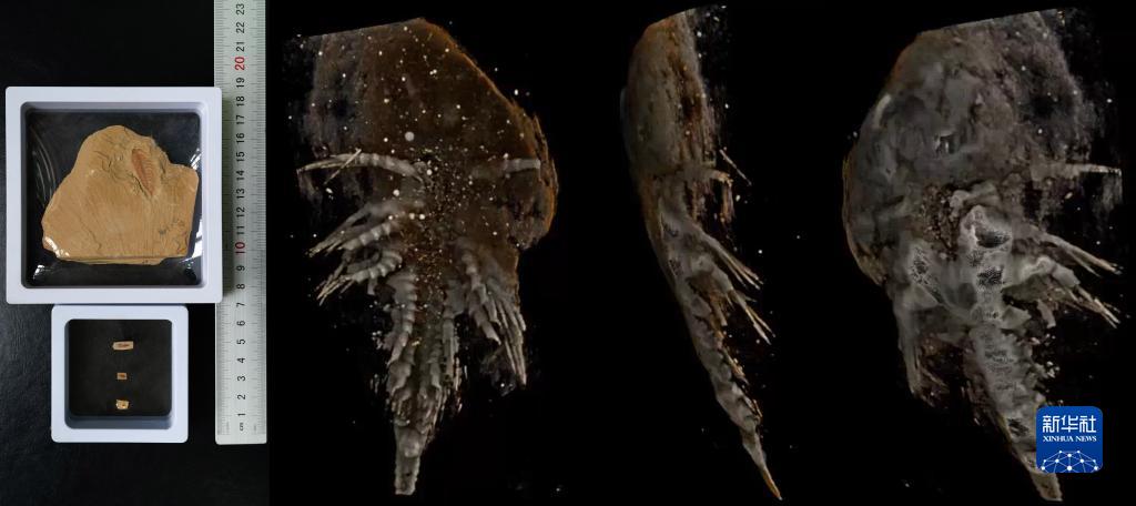 這是一張拼版照片,左邊為不同生長時期的迷人林喬利蟲化石,右邊為云南大學古生物研究院研究員劉煜團隊拍攝的迷人林喬利蟲不同方位的CT片(10月11日攝)。