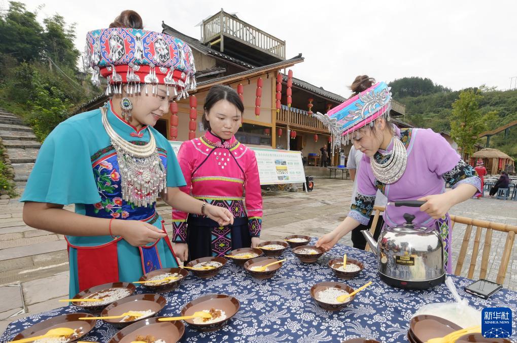 10月10日,在重慶市石柱土家族自治縣橋頭鎮的陶然居瓦屋小寨,當地村民身著民族服裝為游客準備當地特色飲品“米米茶”。