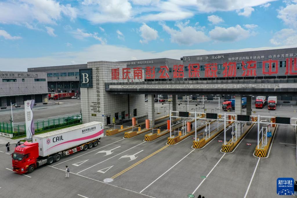 10月11日,滿載筆記本電腦配件、發電機組件等產品的西部陸海新通道跨境公路班車從重慶南彭公路保稅物流中心駛出,將途經廣西憑祥,直達越南(無人機照片)。