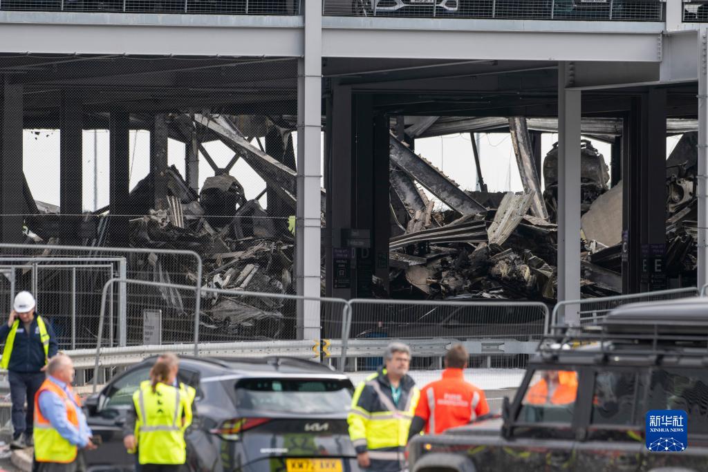 10月11日,在英國倫敦盧頓機場,工作人員在失火停車場附近工作。