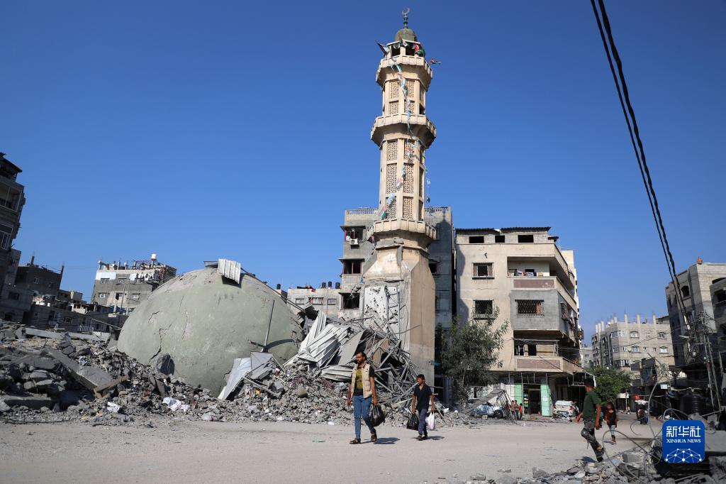 10月11日,在加沙城,人們走過以色列空襲炸毀的建筑廢墟。