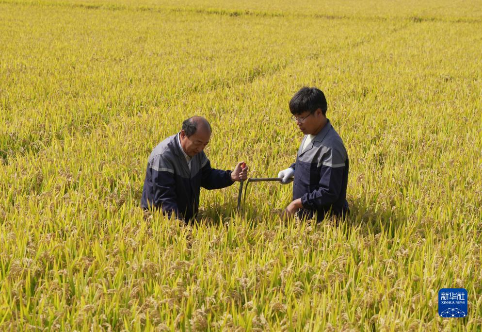 10月11日,在河北省唐山市曹妃甸區(qū)第五農(nóng)場鹽堿地改良而成的高標(biāo)準(zhǔn)稻田,農(nóng)業(yè)科研人員采集測產(chǎn)稻樣。