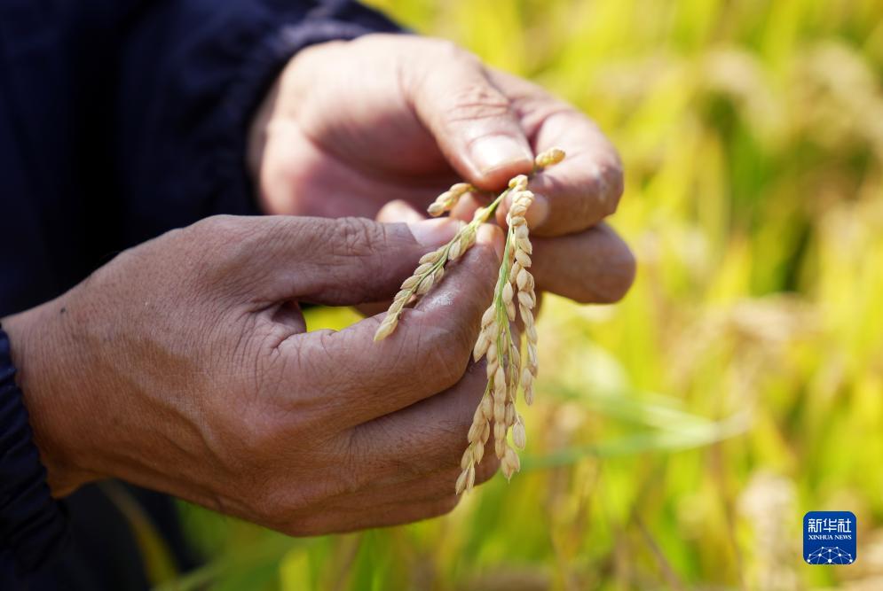 10月11日,農業科研人員在河北省唐山市曹妃甸區第五農場鹽堿地改良而成的高標準稻田查看稻粒的飽滿度。