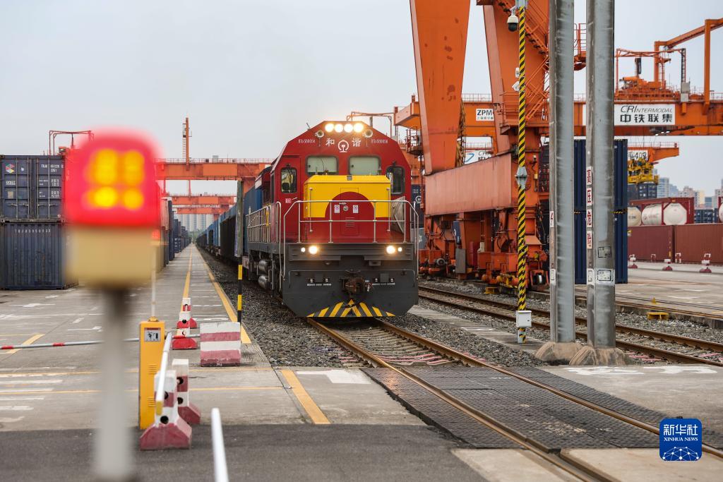 10月11日,一列滿載重質純堿、汽油機等貨物的西部陸海新通道班列,從位于重慶國際物流樞紐園區的重慶團結村中心站駛出。