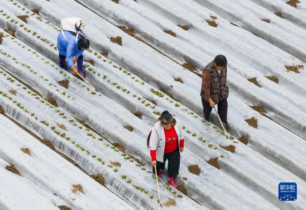 10月11日,在蓬安縣錦屏鎮(zhèn)中壩社區(qū)蔬菜種植基地,村民在田地里進行蘿卜幼苗“破膜露苗”作業(yè)(無人機照片)。