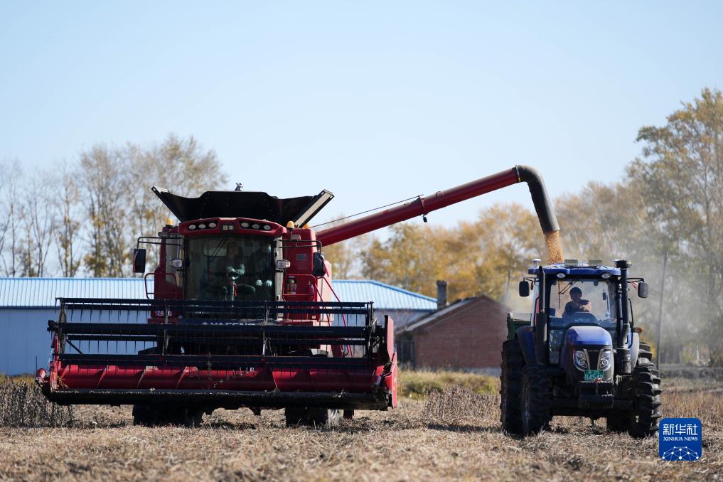 10月11日,在黑龍江省富錦市一大豆地塊的地頭,收割機(jī)卸下剛收獲的大豆。
