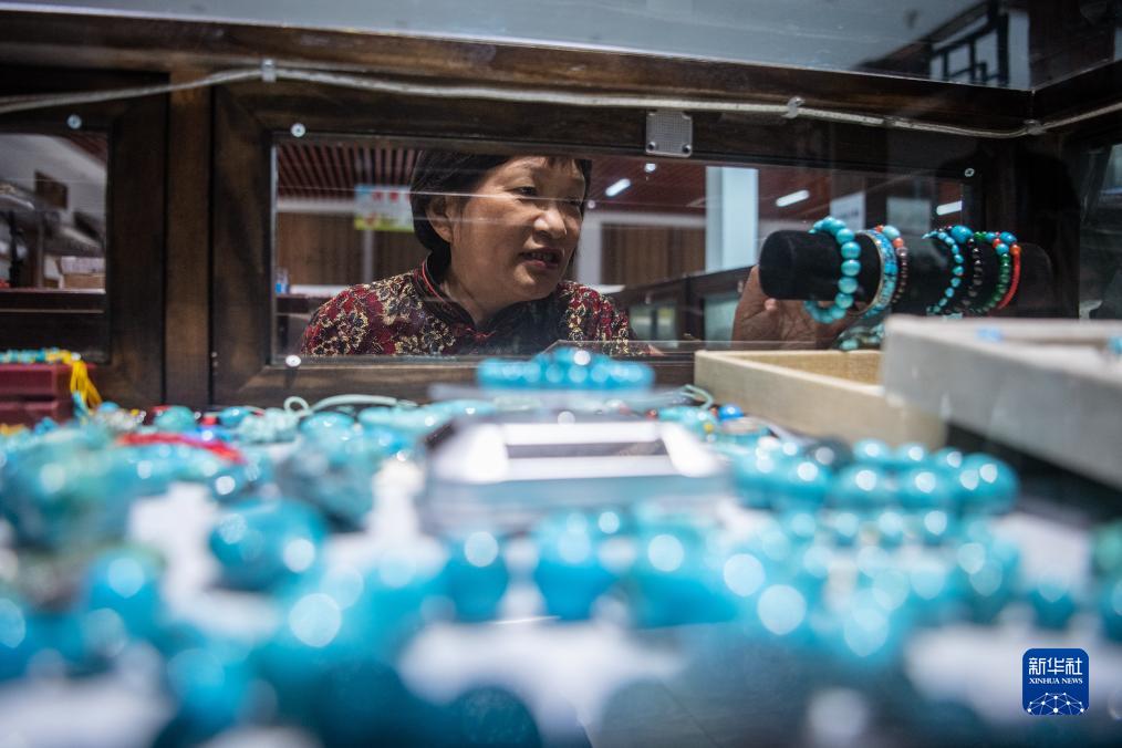 10月11日,湖北省鄖西縣下營村村民郭明鳳在介紹自己展銷柜臺內(nèi)的綠松石制品。
