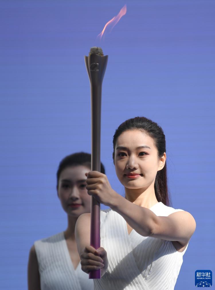10月12日,采火使者在采集儀式上展示引燃的采火棒。