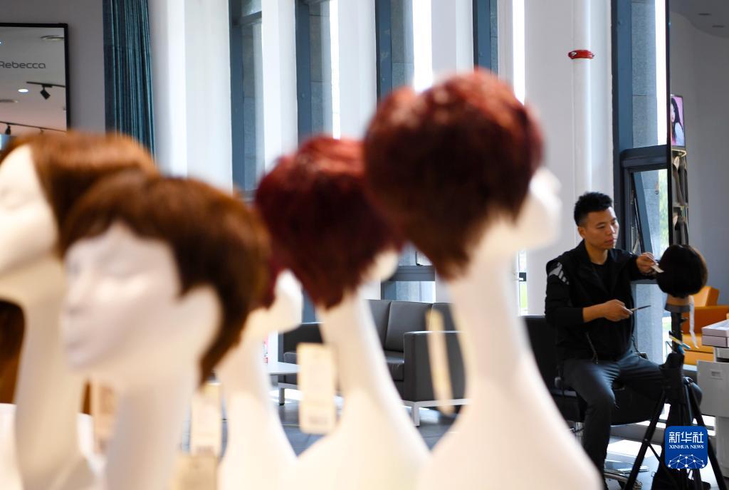 10月11日,工作人員在河南瑞貝卡發制品股份有限公司的展廳內修剪假發。