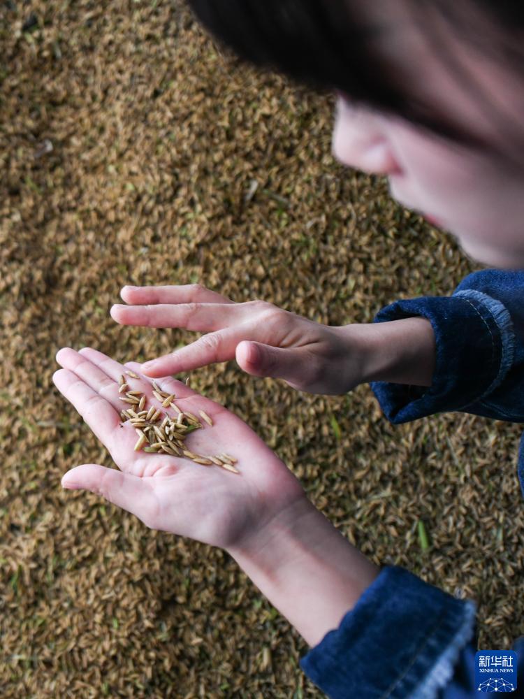 10月10日,在成都崇州市隆興鎮(zhèn),王伶俐在查看今年新收獲水稻的品質(zhì)。