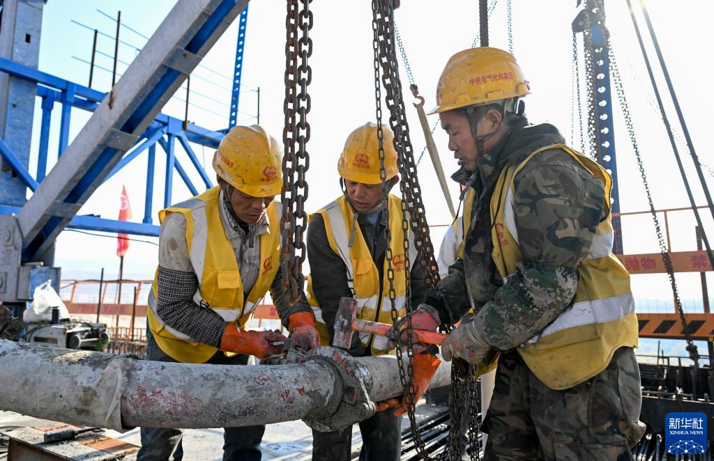 10月12日,工人在集通鐵路電氣化改造工程多倫河特大橋剛構連續梁建設現場作業。