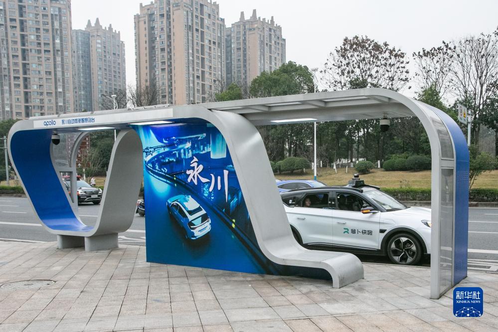 在重慶市永川區,乘客乘坐百度Apollo自動駕駛出行服務車離開自動駕駛智慧站臺(3月1日攝)。