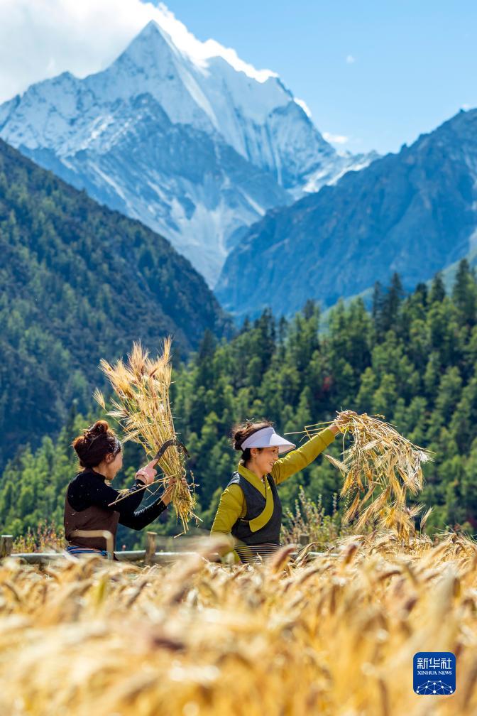 10月12日,在四川甘孜藏族自治州稻城縣亞丁村,村民澤仁拉姆(左)和小松呷在收割青稞。