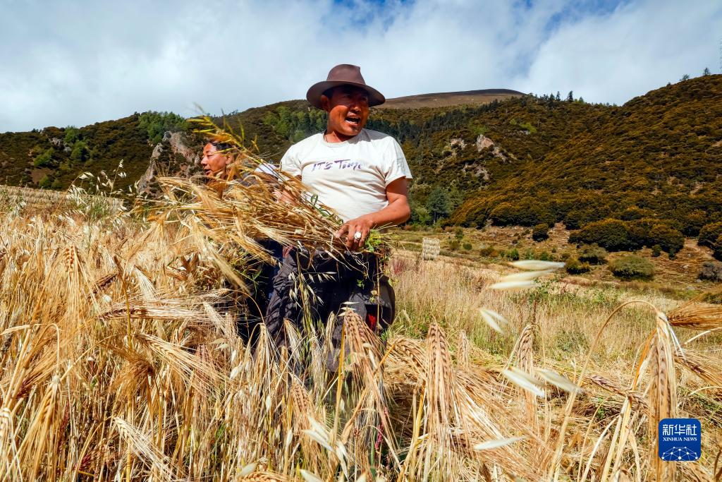10月12日,在四川甘孜藏族自治州稻城縣亞丁村,村民在收割青稞。