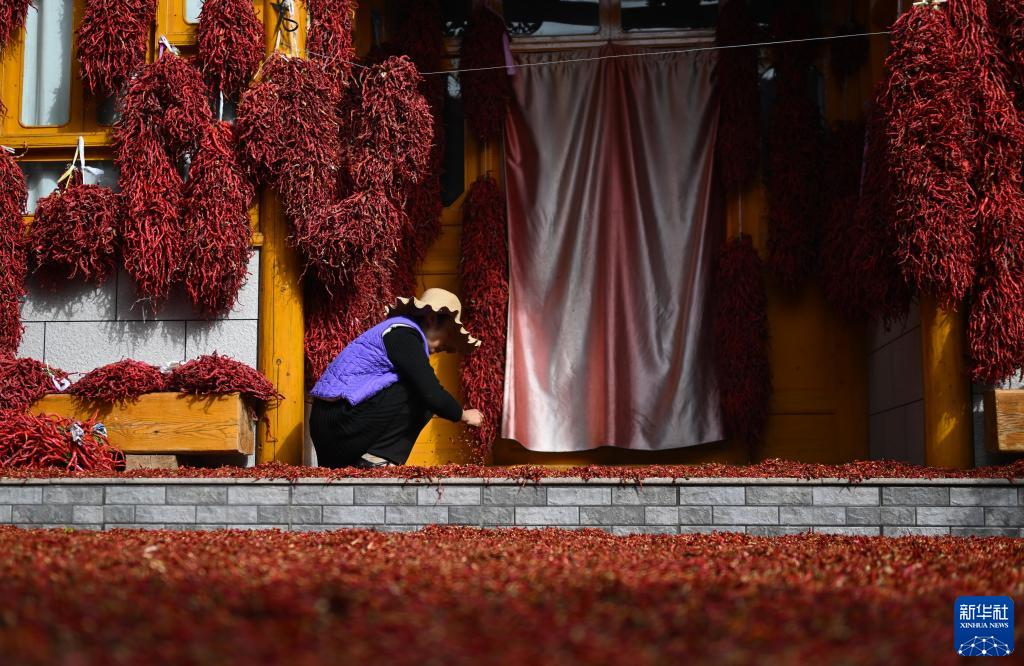 10月12日,在青海省海東市循化撒拉族自治縣清水鄉田蓋村,種植戶在晾曬線椒。