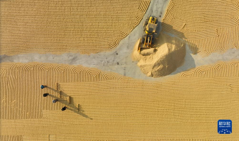 10月12日,在燈塔市禾谷茂源水稻種植專業(yè)合作社,農(nóng)民在晾曬收獲的水稻(無人機(jī)照片)。