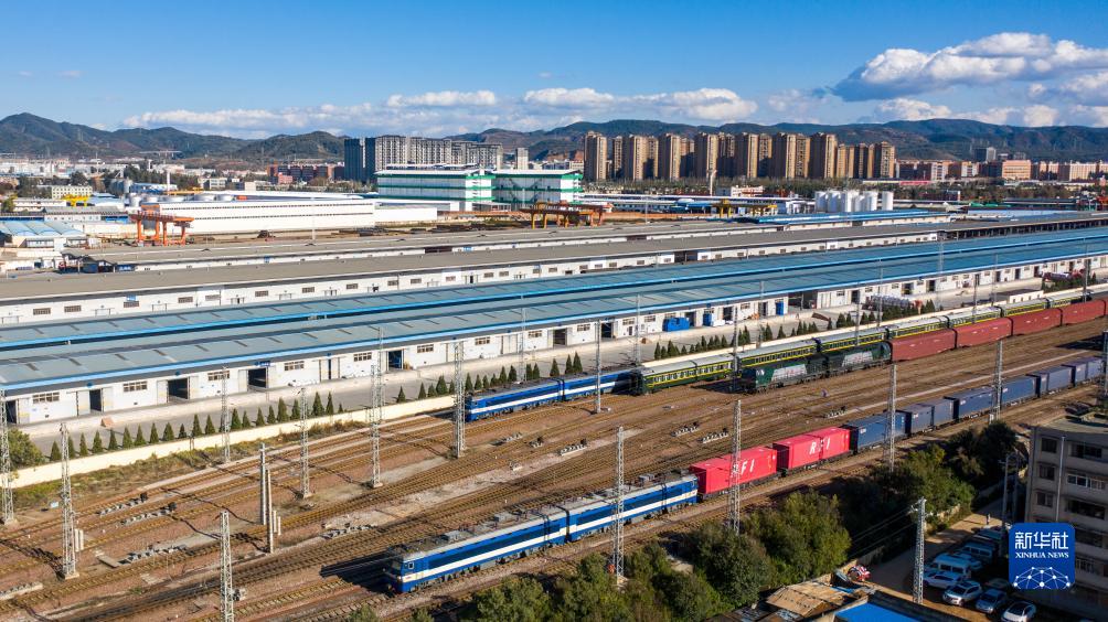 2022年1月1日,滿載30個標(biāo)準(zhǔn)集裝箱的中老鐵路新年首趟國際貨物列車(前)從昆明開往老撾萬象(無人機(jī)照片)。北起中國昆明,南至老撾萬象,全長1035公里的中老鐵路跨越山河,促進(jìn)了中老兩國以及共建“一帶一路”國家間的經(jīng)貿(mào)合作和文化交流,成為聯(lián)通內(nèi)外、輻射周邊、雙向互濟(jì)的黃金大通道。