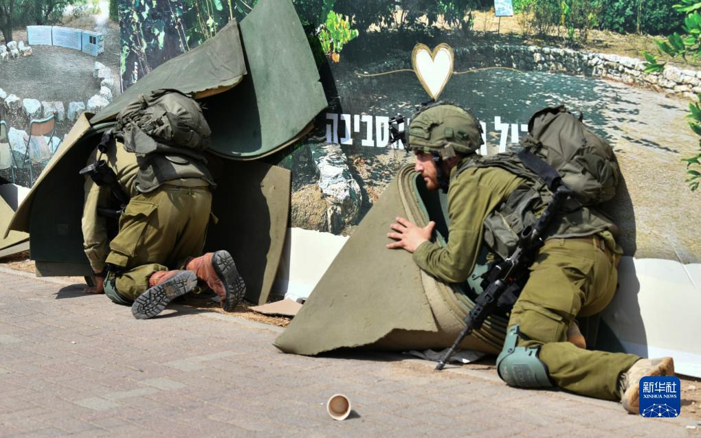 10月12日,以色列南部城市斯代羅特,以軍士兵聽到火箭彈襲擊警報后避險。