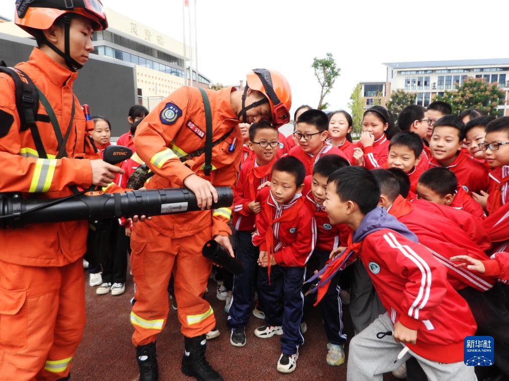 10月13日,在四川省達州市高新區實驗學校,達州市應急救援支隊消防員給學生普及消防知識。
