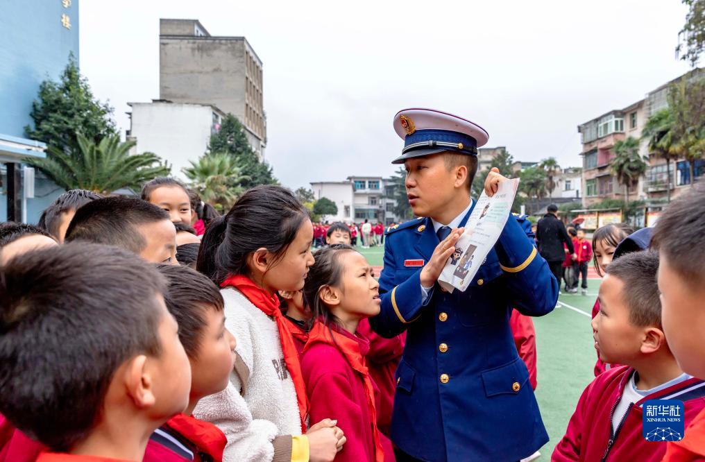 10月13日,消防員在貴州省黔西市第一小學(xué)向?qū)W生宣傳減災(zāi)知識。