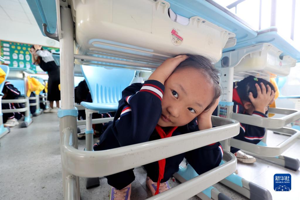 10月13日,浙江省湖州市德清縣二都小學的學生躲避在桌下進行防震應急演練。