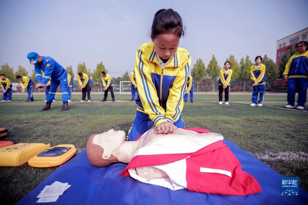 10月13日,藍天救援隊員在河北省遵化市第三中學輔導學生練習心肺復蘇技能。