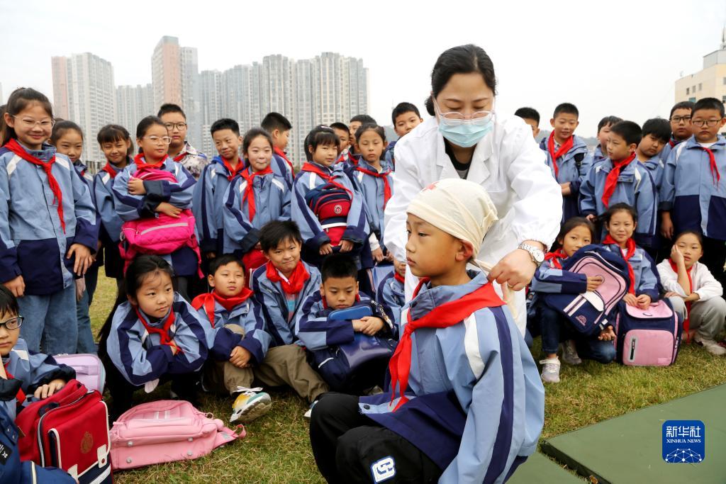 10月13日,在江蘇省連云港市院前小學,醫護人員為學生講解急救常識。