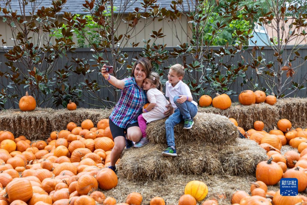 10月12日,游客在美國(guó)得克薩斯州達(dá)拉斯植物園的“南瓜小鎮(zhèn)”內(nèi)自拍留念。