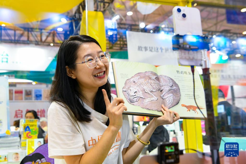 10月13日,在位于成都市世紀城新國際會展中心的2023天府書展主展場,工作人員在直播售賣圖書。