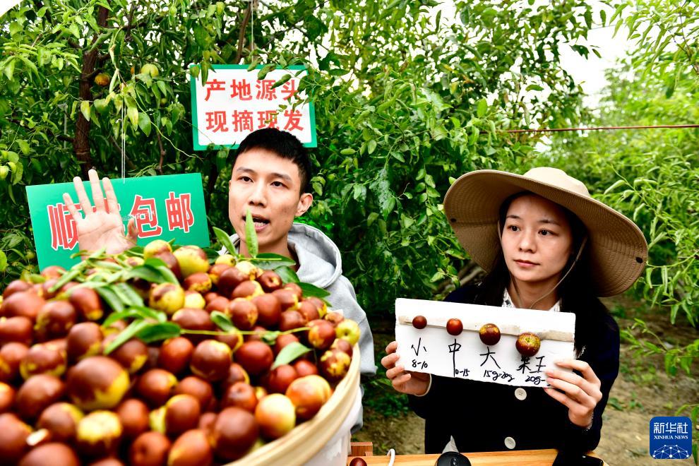 10月12日,在濱州市沾化區下洼鎮,電商主播在棗園里直播賣冬棗。