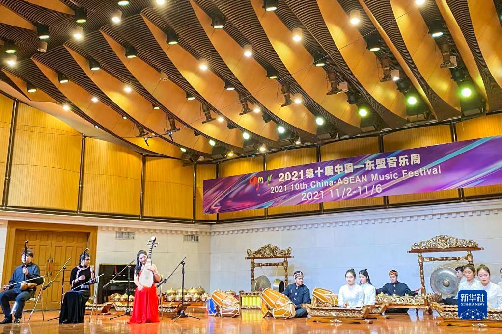 仁迪(左四)帶領樂團成員在第十屆中國—東盟音樂周上演出(2021年11月3日攝)。