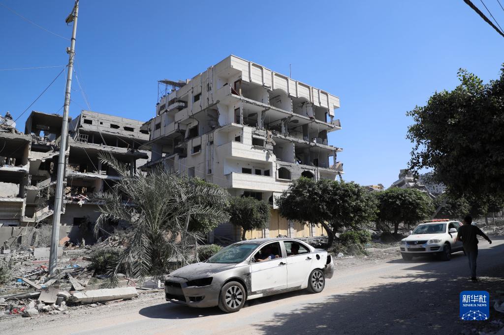 10月13日,在加沙城,人們駕車經過遭以色列空襲損毀的建筑。