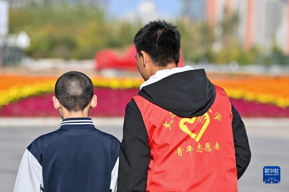 10月13日,志愿者協助盲校學生在太原汾河公園參觀。