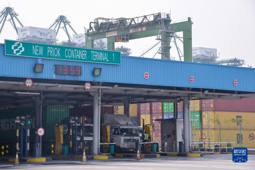 在印度尼西亞雅加達丹戎不碌港,車輛駛出集裝箱碼頭(10月3日攝)。