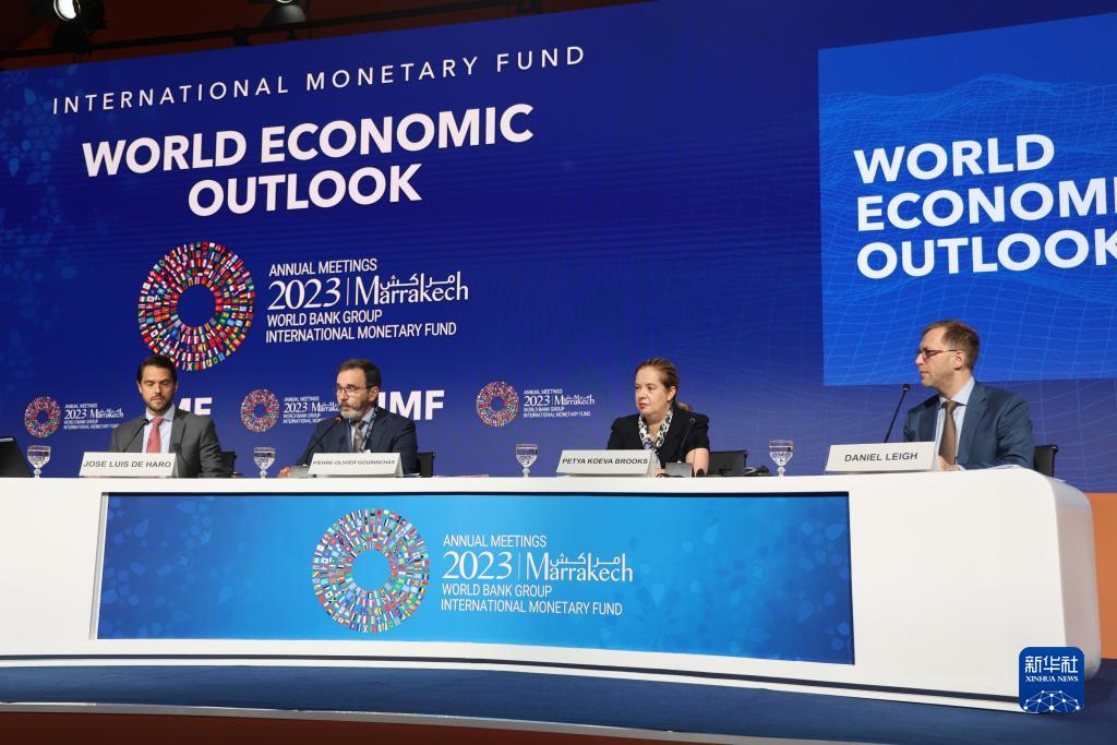 這是10月10日在摩洛哥馬拉喀什拍攝的《世界經濟展望報告》發布會現場。