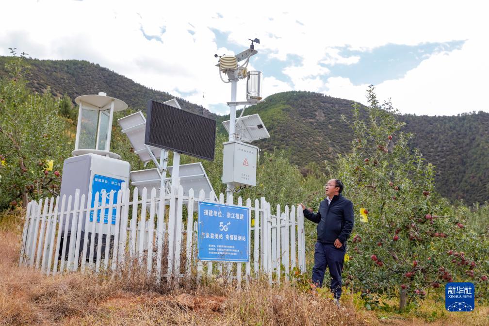 10月13日,在鄉城縣“蘋果+藏豬”種養循環現代農業園區內的有機蘋果種植示范基地,當地農牧農村和科技局的工作人員檢查氣象監測站和蟲情監測站的運行情況。