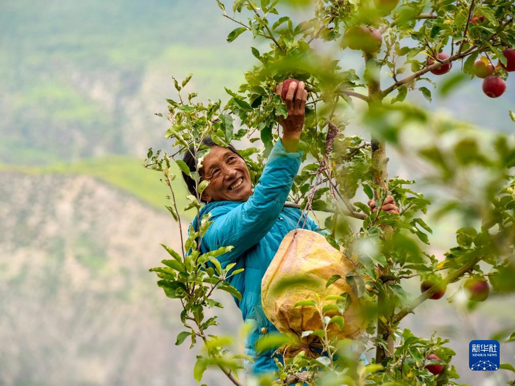10月13日,在鄉城縣“蘋果+藏豬”種養循環現代農業園區內的有機蘋果種植示范基地,當地藏族群眾采摘蘋果。
