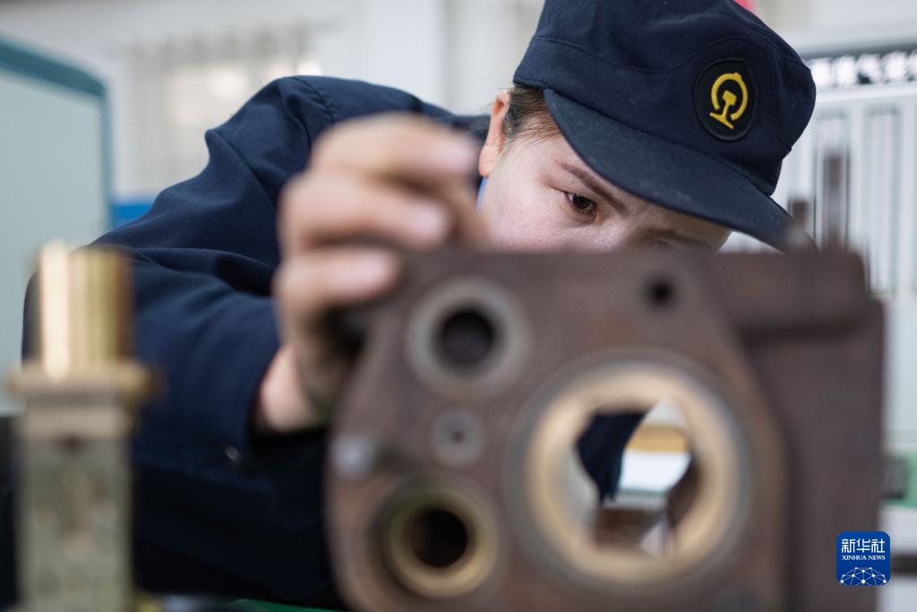 10月12日,在中國鐵路青藏集團有限公司西寧東車輛段制動班組,馬婷在檢查120閥主閥內(nèi)腔。