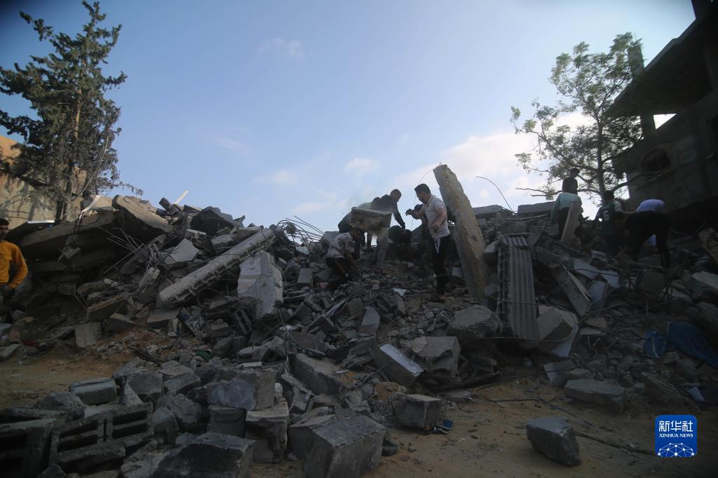 10月14日,在加沙地帶南部城市拉法,人們查看遭以色列空襲炸毀的建筑廢墟。