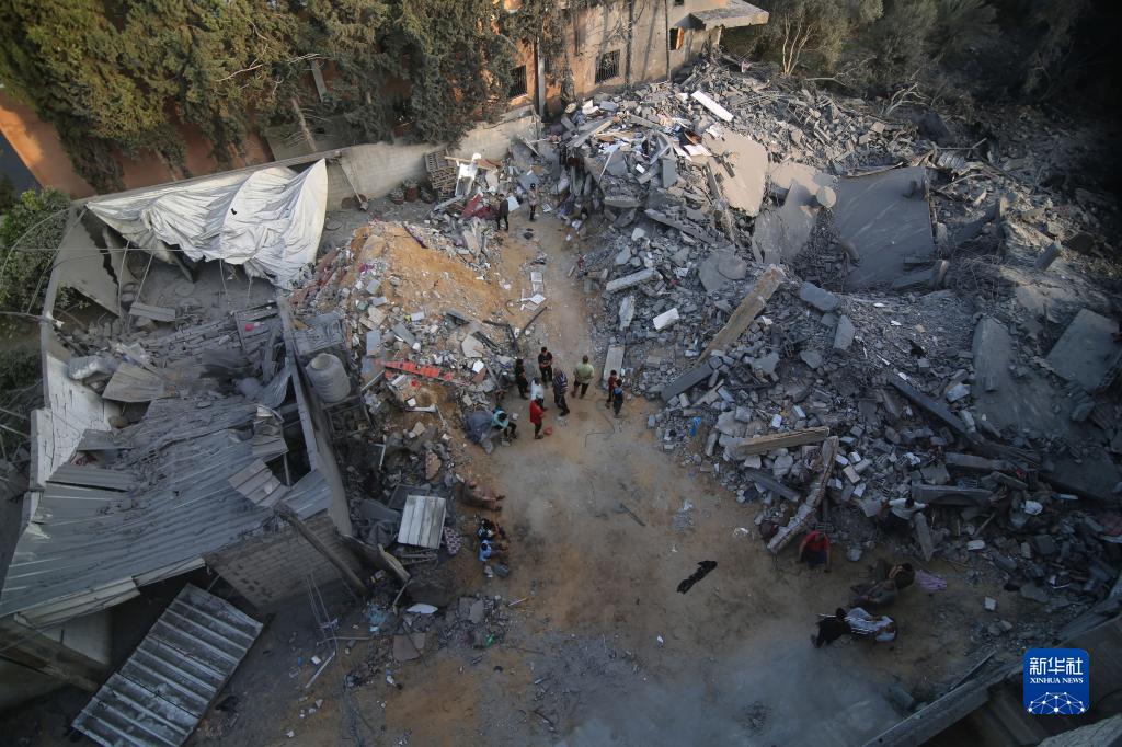 10月14日,在加沙地帶南部城市拉法,人們查看遭以色列空襲炸毀的建筑廢墟。