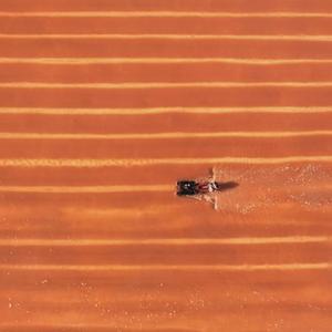 10月14日,工人在河北省灤南縣嘴東經濟開發區鹽場收獲秋鹽(無人機照片)。
