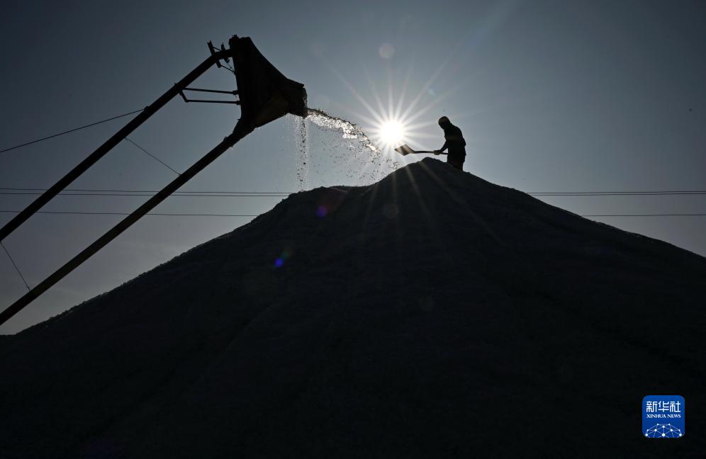 10月14日,工人在河北省灤南縣嘴東經濟開發區鹽場收獲秋鹽。